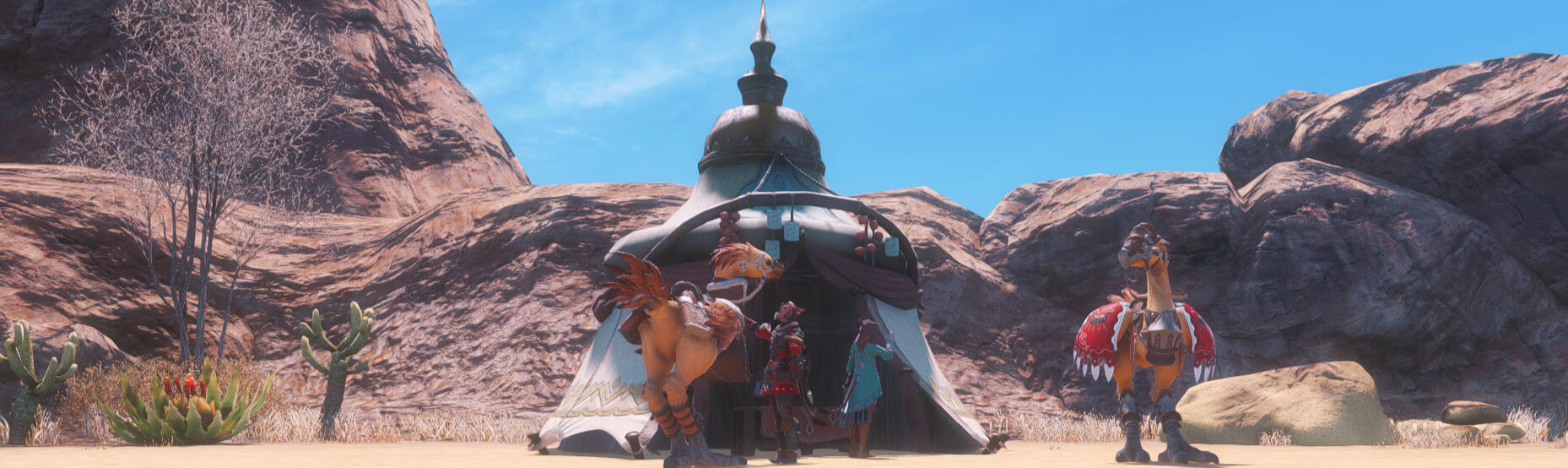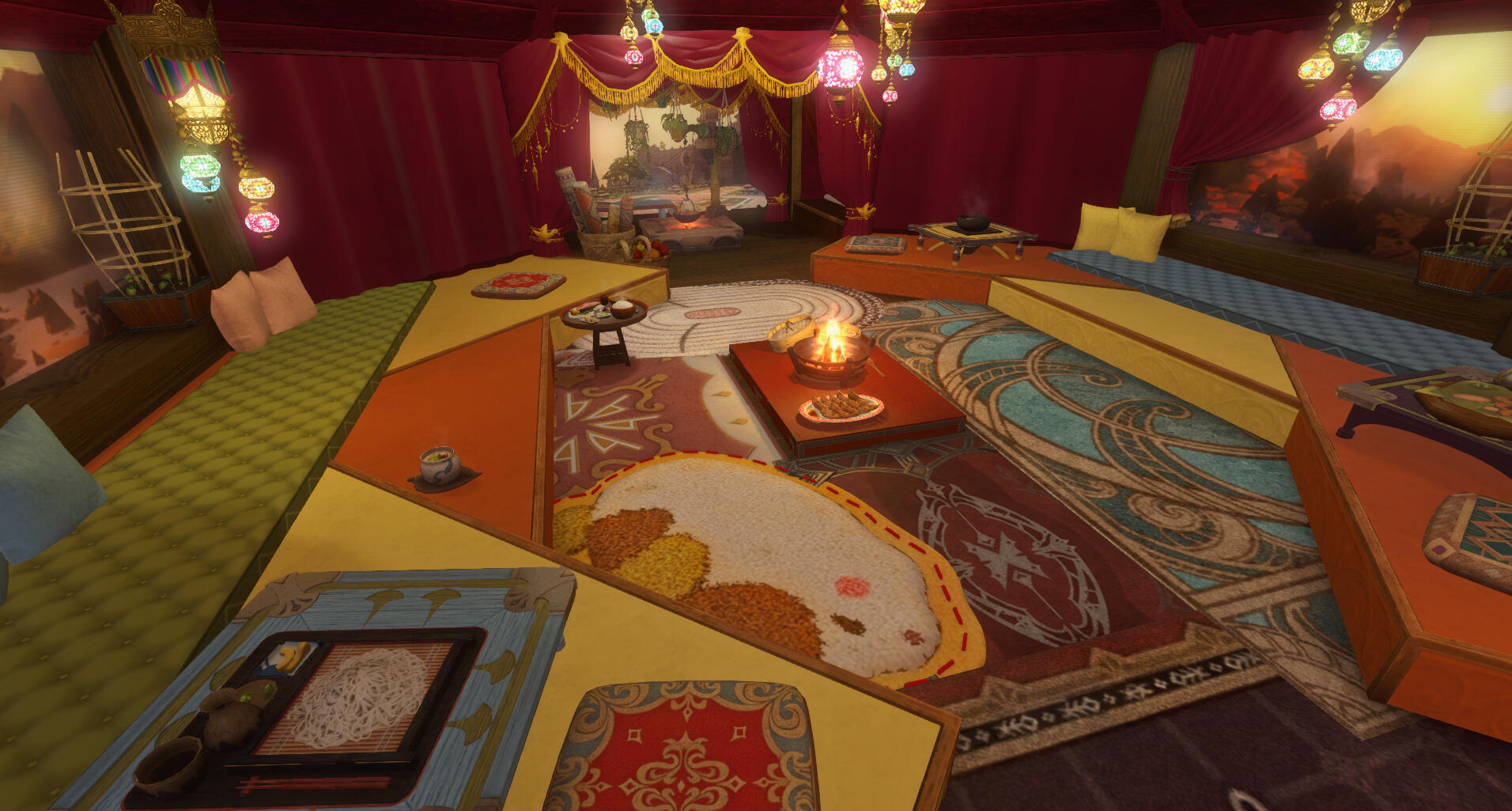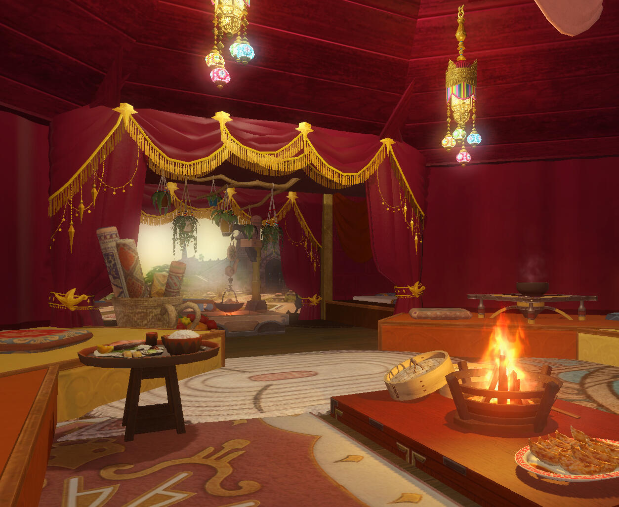 In the tradition of the old Ala Mhigan caravans that operated along the king's highway, the teahouse moves from spot to spot every month, serving merchants, weary travelers, pilgrims, and adventurers.The tea and snacks served at the teahouse reflect the current location, with some dishes, such as buckler stew, adapting to what ingredients are locally available.Guests are encouraged to sit on one of the many cushions and use the low tables to drink tea, talk business, and share stories with fellow travelers.